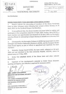 An 11-member team failed to register and participate in the competition slated for late April in Norway. In a document released by the National Security authority released on July 3,2024 and sighted by 3Sports, Nana Antwi, a member of the team was earlier apprehended and detained in late April by Norweigian security officials after attempting to depart to Sweden.