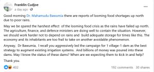 “Anyway, Dr. Bawumia, l recall you aggressively led the campaign for 1 village-1 dam as the best strategy to augment existing irrigation systems. And billions of money was poured into these dams. May l know the status of these dams? When are we expecting them to kick in and help?” He wrote on his Facebook page.
